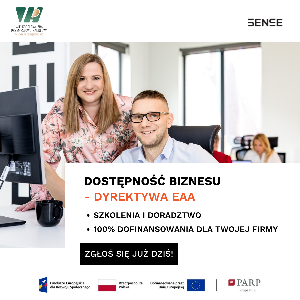 Wielkopolska Izba Przemysłowo-Handlowa wraz z Grupą SENSE zaprasza przedsiębiorców do udziału w wyjątkowym projekcie szkoleniowo-doradczym „I-D-EAA Academy. Dyrektywa EAA w praktyce”. To szansa na zdobycie realnej przewagi konkurencyjnej i pełne przygotowanie do wymogów Europejskiego Aktu o Dostępności (EAA) – z 100% dofinansowaniem w ramach pomocy de minimis. Czytaj dalej