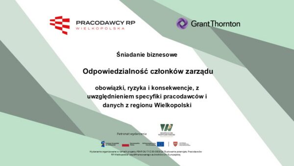 Szczególne podziękowania kierujemy do prelegentek z Grant Thornton, partnera wydarzenia. Ich merytoryczny wkład, oparcie prezentacji na najnowszym raporcie „Odpowiedzialność członków zarządu – analiza praktyczna” oraz praktyczne spojrzenie na ryzyka prawne i finansowe pozwoliły uczestnikom przełożyć dane na konkretne wnioski przydatne w codziennym zarządzaniu. Dziękujemy także panelistom za otwartość i odważne podejście do tematów, które niejednokrotnie budzą w firmach realne obawy i wątpliwości.