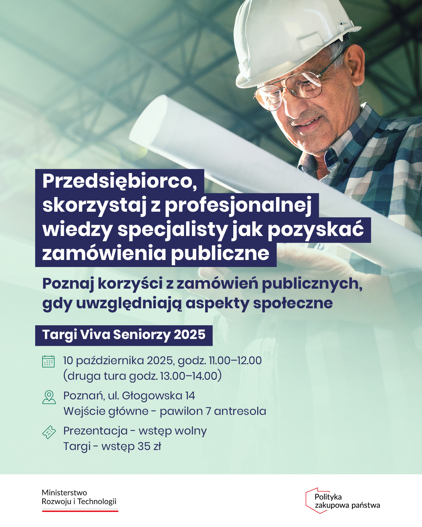 Ministerstwo Rozwoju i Technologii zaprasza na prezentację poświęconą wykorzystaniu aspektów społecznych w zamówieniach publicznych, która odbędzie się w trakcie Targów Viva Seniorzy 2025 w Poznaniu. Dowiedz się, jak dzięki klauzulom społecznym w zamówieniach publicznych możesz zdobyć nowe kontrakty i jednocześnie wspierać aktywizację zawodową osób starszych. To wiedza, która przełoży się na realne korzyści dla Twojej […]