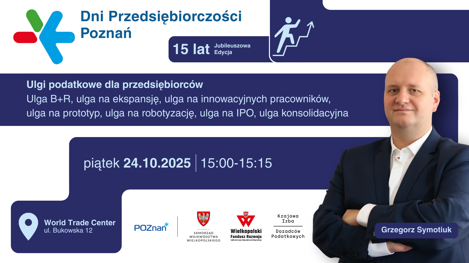 - 15:00-15:15 Grzegorz Symotiuk: Ulgi podatkowe dla przedsiębiorców: ulga B+R, ulga na ekspansję, ulga na innowacyjnych pracowników, ulga na prototyp, ulga na robotyzację, ulga na IPO, ulga konsolidacyjna.