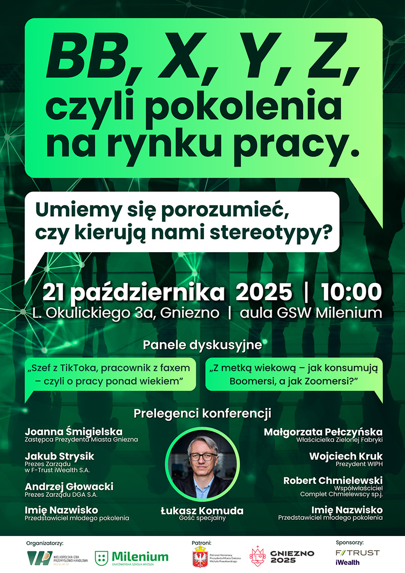 „BB, X, Y, Z, czyli pokolenia na rynku pracy. Umiemy się porozumieć, czy kierują nami stereotypy?” – to tytuł konferencji problemowej, która odbędzie się 21 października w auli Gnieźnieńskiej Szkoły Wyższej Milenium w Gnieźnie.