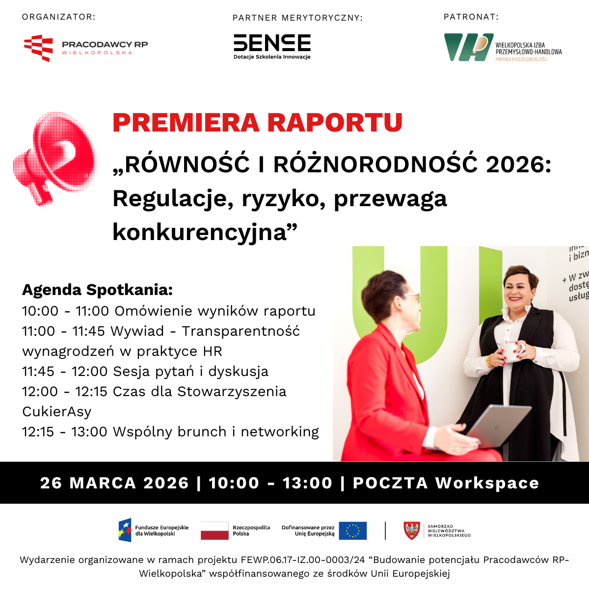 Zapraszamy na premierę raportu „Równość i różnorodność 2026: Regulacje, ryzyko, przewaga konkurencyjna”. To wyjątkowe opracowanie, które pokazuje konkretne wyzwania i zagrożenia dla firm, które nie dbają o równość i transparentność w organizacji. 26.03.2026 r. godziny 10.00-13.00 Poczta Worksapce ul.23 lutego 26/316 Poznań.
