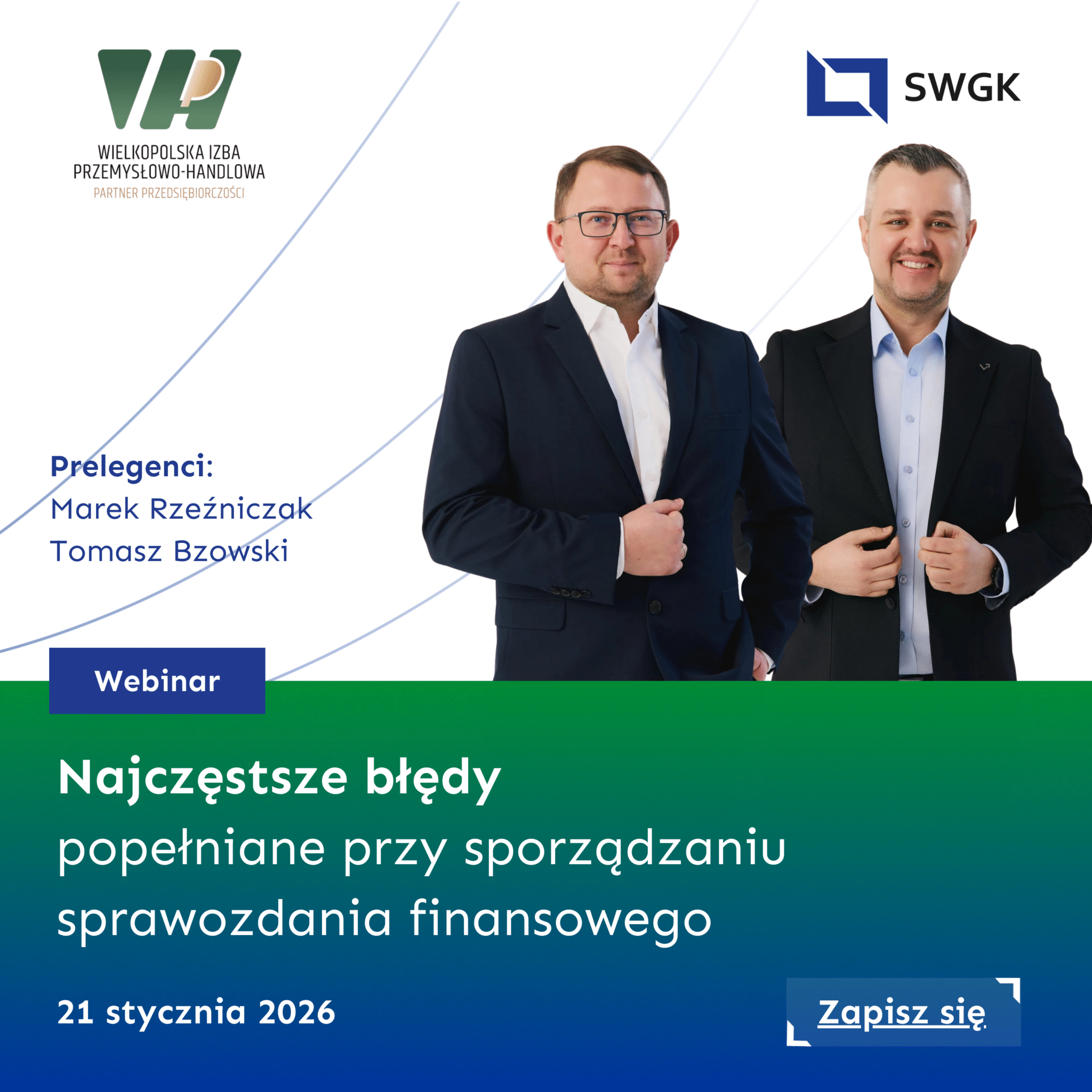 Wielkopolska Izba Przemysłowo-Handlowa oraz SWGK zapraszają na 45-minutowy, intensywny i w pełni praktyczny webinar, podczas którego dwaj doświadczeni eksperci pokażą, jak unikać najczęstszych błędów i usprawnić proces zamknięcia roku.